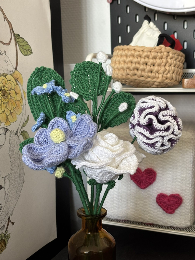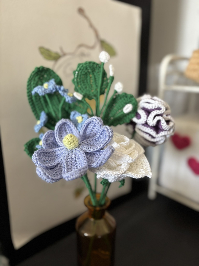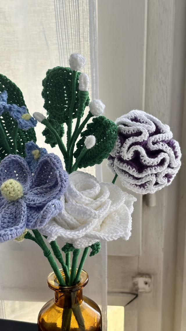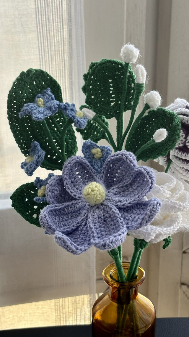 Ce bouquet crocheté ne se fane jamais et conserve son charme éternellement. Un élément décoratif élégant et durable, parfait pour une ambiance douce et relaxante.